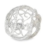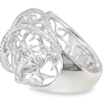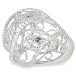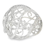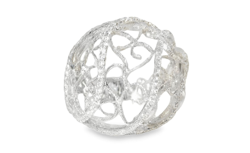 This 18K White Gold Diamond Filigree Scroll Band Ring is a true masterpiece that combines intricate design with stunning sparkle. Featuring a detailed filigree scroll pattern adorned with numerous brilliant...
