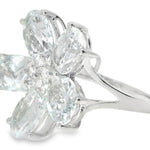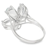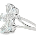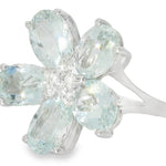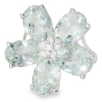 This 18K White Gold Diamond Aquamarine Floral Ring is a stunning blend of natural beauty and elegant design. Featuring 5 oval aquamarines totaling nearly 1 carat and 6 brilliant round diamonds weighing 0.10 carats, this floral-inspired ring radiates sophistication and charm. The top of the ring, measuring 3/4 inch wide at its widest point, creates a bold yet graceful statement on your finger.
