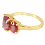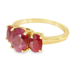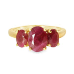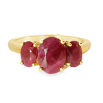 Exquisite 14K yellow gold burma ruby filigree ring band. This 3-stone ring features one large genuine burma ruby in the center measuring about 7mm by 9mm, flanked by two slightly smaller burma rubies measuring 4mm by 5mm each. The total weight of the rubies is 2.3 carats. The ring weighs 3.5 grams. It is a size 8. Sizing is available.