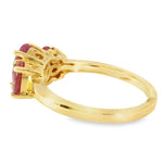 Exquisite 14K yellow gold burma ruby filigree ring band. This 3-stone ring features one large genuine burma ruby in the center measuring about 7mm by 9mm, flanked by two slightly...