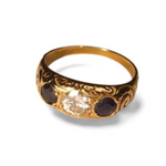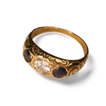 Gorgeous Antique 14K Yellow Gold Diamond Sapphire 3-Stone Wedding Ring Band. The top of the ring measures .25 of an inch wide. The ring is a size 6.75. Sizing is available for an additional charge. The ring weighs 3.3 grams.