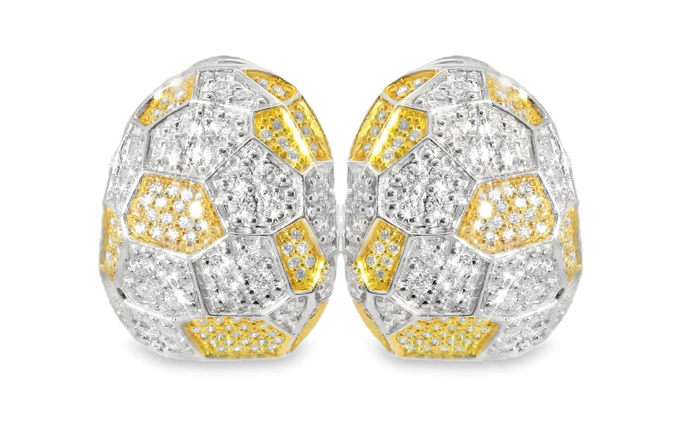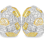 18K White Gold Geometric Beehive Diamond Earrings. These striking earrings feature a unique geometric design inspired by a beehive pattern, adorned with brilliant round white diamonds. The total diamond weight ensures a dazzling display of sparkle, making these earrings the perfect addition to any fine jewelry collection. The sophisticated 18K white gold setting enhances the modern yet timeless design, making them ideal for both special occasions and everyday elegance.