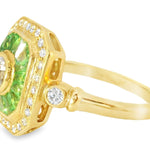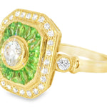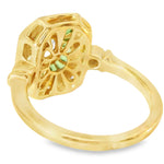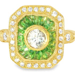 This Art Deco-inspired 14K Yellow Gold Mosaic Ring showcases exquisite craftsmanship and vintage charm. The design features a dazzling white sapphire at its center, surrounded by vibrant French-cut tsavorites totaling 0.75 carats, and sparkling brilliant round diamonds with a total weight of 0.22 carats. The harmonious combination of gemstones creates a stunning mosaic effect, adding a touch of elegance and uniqueness to the piece.