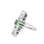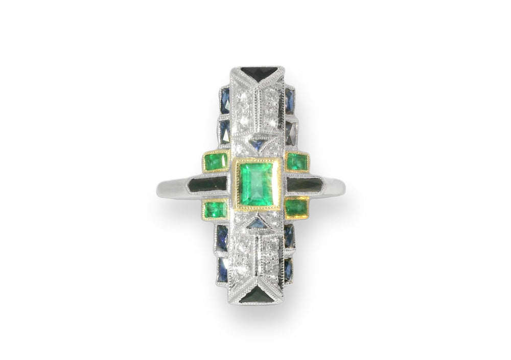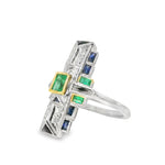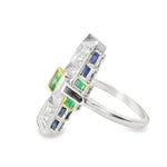Handmade Art Deco 18K White Gold Emerald Sapphire Diamond Mosaic Ring. This gorgeous ring features 1 natural emerald in the center, hand cut emeralds and sapphires weighing a total of 1.36 carats and diamonds totaling .16 carats. The ring weighs 6 grams. It is a size 6.75. Sizing is available.