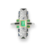 Handmade Art Deco 18K White Gold Emerald Sapphire Diamond Mosaic Ring. This gorgeous ring features 1 natural emerald in the center, hand cut emeralds and sapphires weighing a total of...