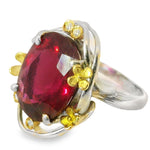 Introducing a magnificent 18K yellow gold and platinum ring, featuring a stunning 14-carat natural oval rubellite at its center, measuring 18 mm by 14 mm. This exquisite piece is further adorned with four brilliant round diamonds, totaling 0.08 carats, adding a touch of sparkle to the vibrant rubellite. The top of the ring measures 7/8 inch in length and width, offering a substantial yet elegant presence on the finger. Weighing 13.1 grams, this ring is currently a size 7, with resizing options available to ensure a perfect fit.