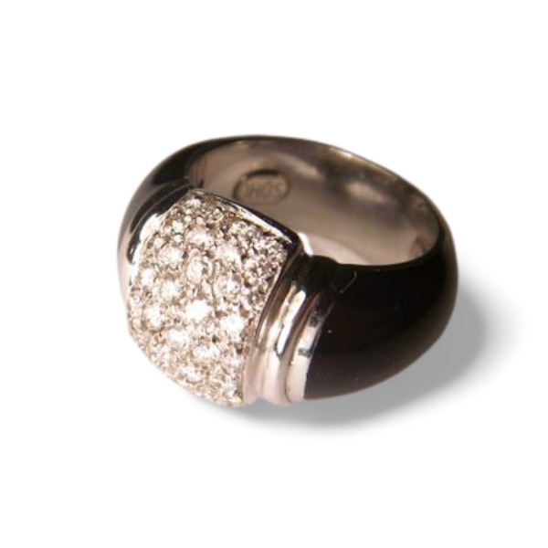 This stunning 18K White Gold Black Enamel Diamond Designer Ring Band combines sleek black enamel detailing with the brilliance of numerous round diamonds totaling 1.1 carats. The elegant contrast between the white gold and black enamel creates a bold and contemporary look, perfect for making a statement.