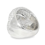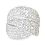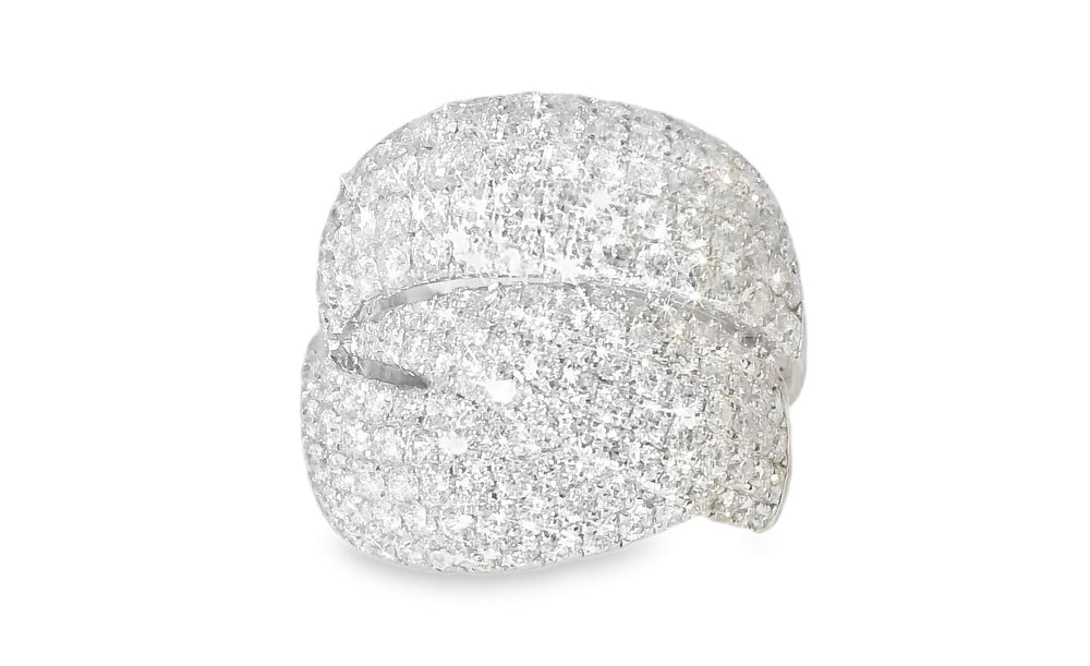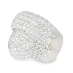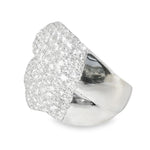 This breathtaking 18K white gold diamond designer ring exudes luxury and elegance. Featuring numerous brilliant round diamonds, this stunning piece offers a dazzling total diamond weight of 2.71 carats. The top of the ring measures 3/4 inch across, making it a bold statement piece. Weighing 9.3 grams, this ring is a perfect combination of sophistication and timeless beauty. Available in size 6.5, with resizing options available for an additional fee.