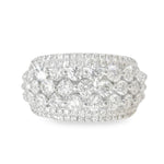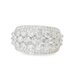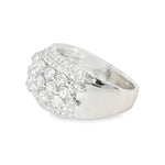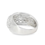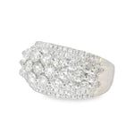 This dazzling 18K white gold diamond designer ring is a true statement piece, featuring numerous brilliant round diamonds in various sizes, creating a sparkling and luxurious design. With a total diamond weight of 2.32 carats, the ring offers exceptional brilliance and shine. The top of the ring measures 1/2 inch across, giving it a bold yet elegant presence. Weighing 6.7 grams, this exquisite ring is available in size 6.5, with resizing options available for an additional fee.