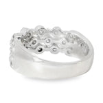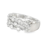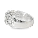 This fabulous 14K white gold 3-row diamond wedding band ring exudes elegance and sophistication. Featuring numerous brilliant round diamonds of various sizes, the band creates a stunning layered effect that sparkles from every angle. With a total diamond weight of 1.5 carats, this luxurious piece offers a striking combination of brilliance and refined design. The top of the ring measures 3/8 of an inch across, making it the perfect width to showcase the diamonds without being overwhelming. Weighing 7.2 grams, this ring is substantial yet comfortable, and it is a size 6.75 with resizing options available for an additional charge.