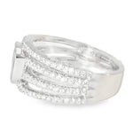 Gorgeous Estate 14K White Gold Engagement Diamond Ring. This unique piece features numerous brilliant round and baguette diamonds totaling 1.17 carats. The band measures 3/8 of an inch wide. It weighs 8.1 grams. It is size 6.5. Sizing is available for an additional charge.