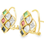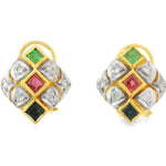 These 18K Yellow Gold Earrings are a true masterpiece, combining the beauty of three vibrant gemstones with the brilliance of diamonds. The rich colors of the ruby, emerald, and sapphire are perfectly complemented by the sparkle of the diamonds, making these earrings a luxurious and timeless addition to your jewelry collection. Whether for a special occasion or to elevate your everyday look, these earrings will surely make a statement.