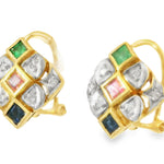 Stunning pair of estate 18K Yellow Gold Earrings. Each earring features one natural princess-cut ruby, one emerald, and one sapphire, beautifully complemented by 6 brilliant round diamonds. The vibrant gemstones and sparkling diamonds are set in luxurious 18K yellow gold, creating a timeless and sophisticated look. The earrings measure just over half an inch long and wide, and the pair weighs 4.4 grams, making them the perfect size for any occasion.